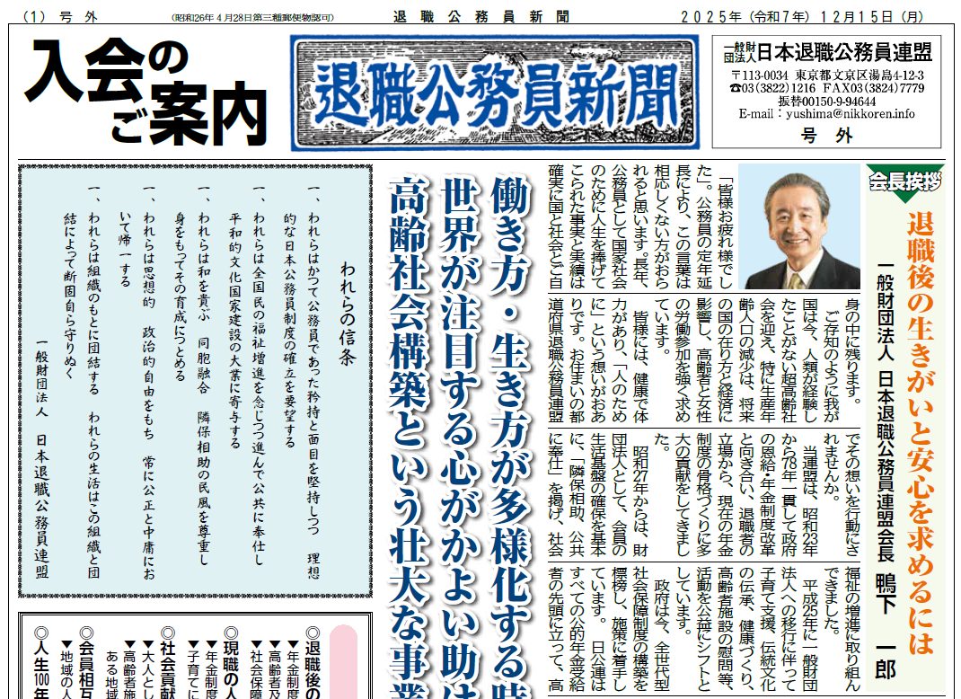 退職公務員新聞2025年12月号特別号を発刊いたしました。 お知らせの下部「退職公務員新聞画像」をクリックしていただくことで閲覧が可能です。