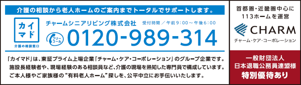 当事業に関わる民間事業者は、介護事業を展開する株式会社チャ-ム・ケア・コ-ポレ-ション(東証プライム上場)、施設の紹介と相談に当たる全国にネットを広げる系列のチャ-ムシニアリビング株式会社。前者は東京圏と近畿圏で介護事業を展開し、後者は前者の施設を含めて全国の会員の方々がお住いの土地の適切な施設を探して紹介し、相談に応じます。